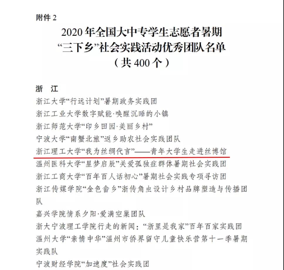 《“我为丝绸代言“——青年大学生走进丝博馆》实践团喜获全国优秀团队称号。据悉,2020年7月以来,全国共有2000余所大中专院校、超过500万名学生、25万多支实践队伍参与活动。最终遴选出300个优秀单位、400个优秀实践团队、400名优秀个人。