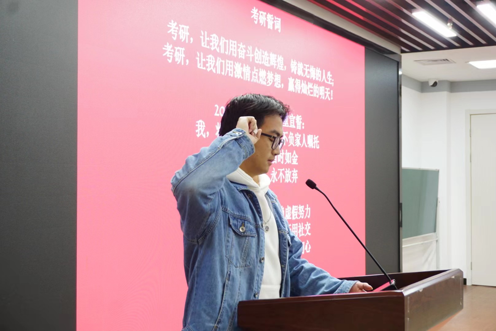 接下来,纺织工程20(2)班温志华同学带领2020级考研同学集体宣誓。须知少时凌云志,曾许人间第一流,铮铮的誓言展现了同学们敢于亮剑、不畏困难、坚持到底的研途精神。