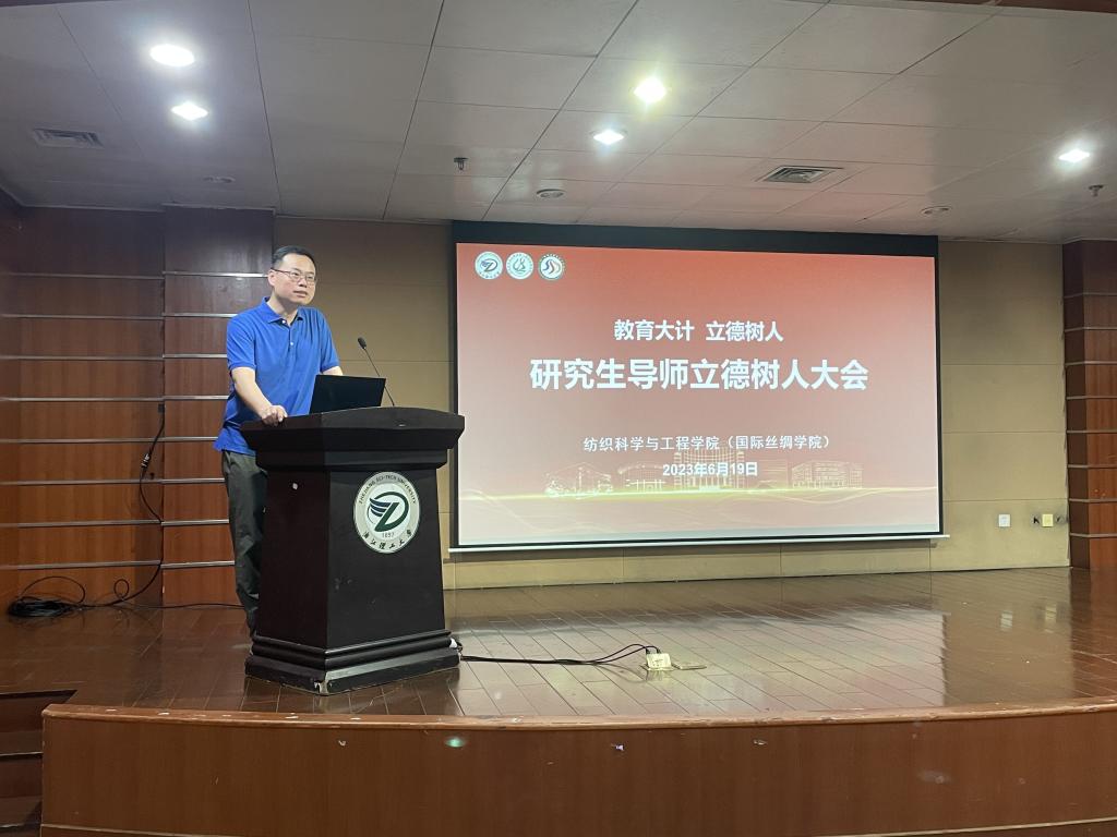 学院党委书记徐伟强介绍研究生导师队伍建设情况,分析学院研究生导师的现状与进一步发展目标,他希望导师们一要认清立德树人工作在导师队伍中的根本性意义,把立德树人的成效作为检验一切工作的根本标准;二要认清立德树人工作在导师自身职业发展中的决定性意义,坚持和学生一起成长、成就教学相长;三要认清履行立德树人职责对整个学院办学发展的长远性意义,为学校“双一流”建设目标贡献纺织力量。