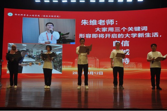 教师代表、辅导员代表、老生代表和外籍教师代表做主题发言《我,有一个问题》,“用哪三个关键词形容即将开启的大学新生活?”、“如何在浙理纺织成为更好的自己?”、“如何在大学校园中平衡并把握工作和学习,以实现自我价值的最大化?”、“作为一名辅导员如何更好地陪伴大家成长成才”、“ How To Adapt To A new Academic Environment As An International Student?”,每一问都是新生入学踏实、安心走好大学每一步的灵魂之问、宝藏之问。