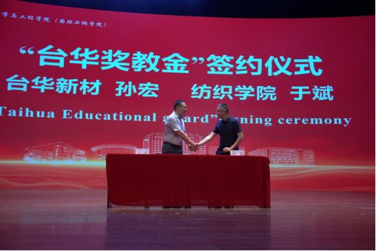 于斌院长与浙江台华新材料股份有限公司总裁助理孙宏进行“台华奖教金”签约。