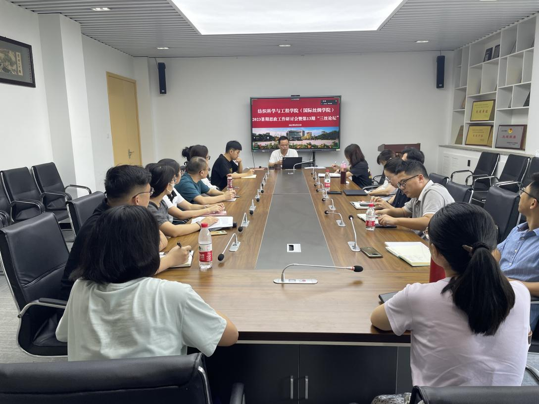 在17-312举行第三届暑期思政工作研讨会暨第13期“三丝论坛”。会议采用线上线下相结合的方式进行,院党委副书记方平出席,全体辅导员、新老班主任共五十余人参加会议。