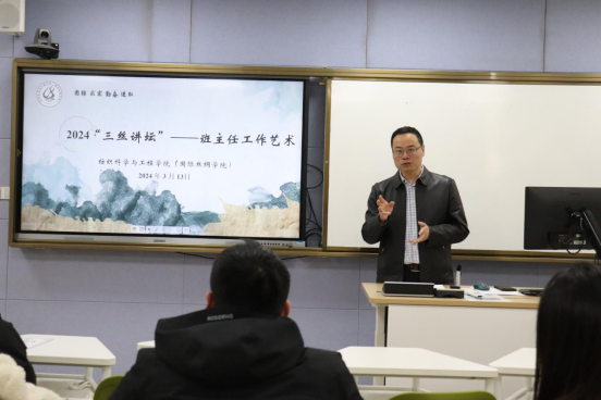 期间,学院党委副书记方平围绕“班主任”“工作”“艺术”三个关键词做解读,其中“班主任”要笃定“思想引领、文化引导、学风引育”,“工作”要明细“目标、过程、效果、导向”,“艺术”也要突出“语言、行为、情感”,与专职思政工作者一起,构建立德树人新生态新格局。