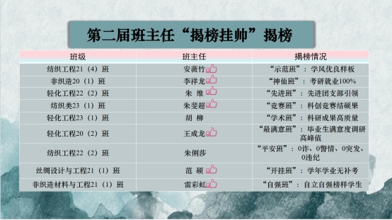 活动伊始,方平为学院2023年度“春蚕奖”班主任颁奖。在过去的一年中,他们工作开展有方法、育人方式有温度,在学生思政工作中取得了亮眼的成绩。颁奖之后,“揭榜”班级班委为班主任发榜授联。