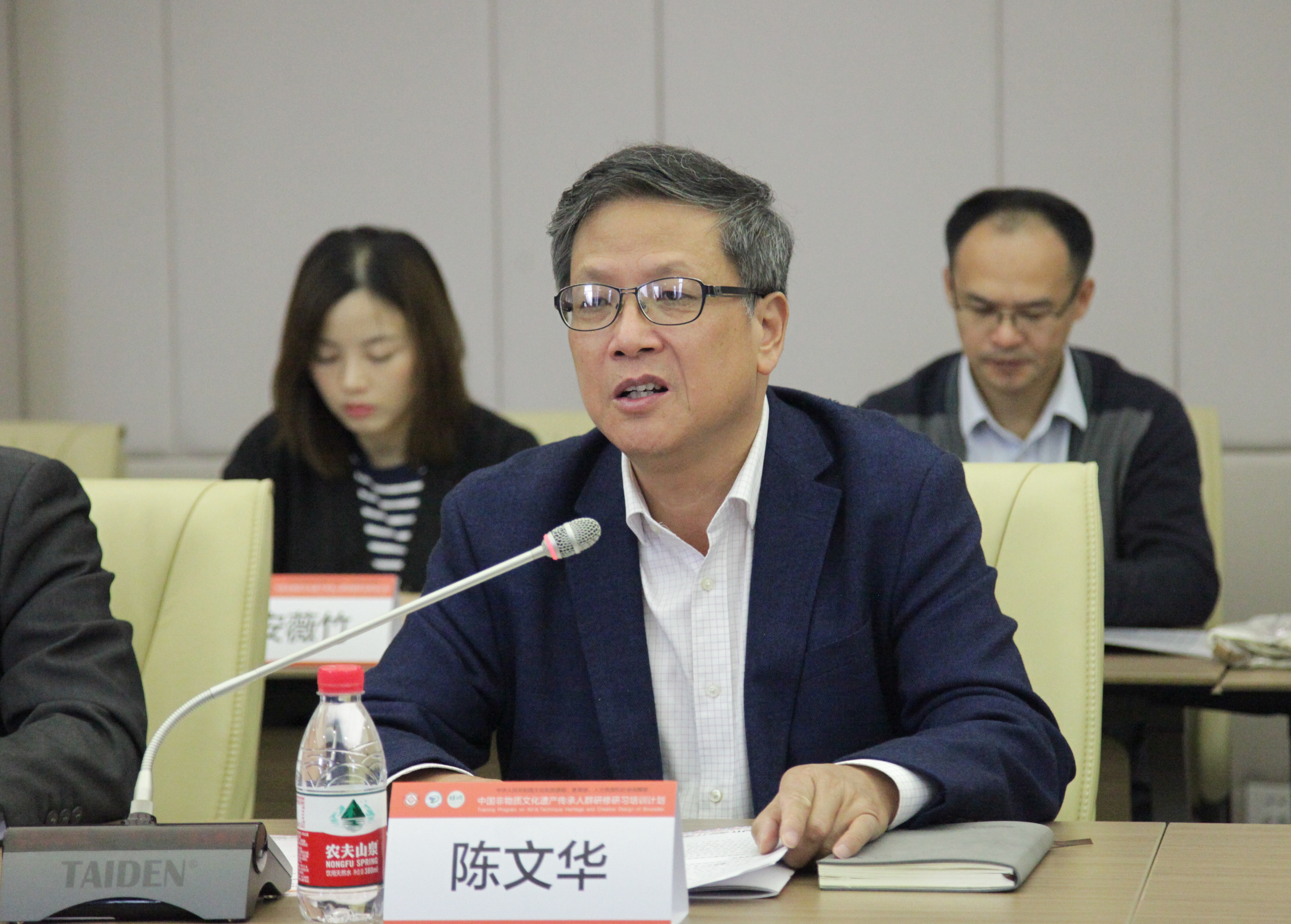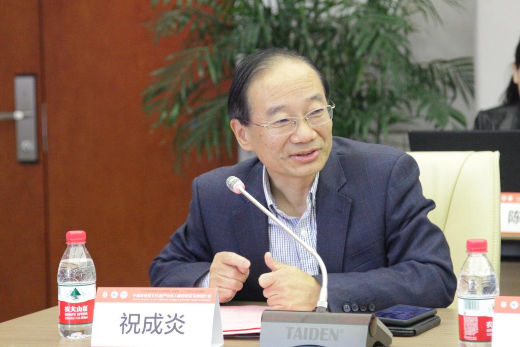 祝成炎教授介绍了“中国非物质文化遗产传承人群研修研习培训计划——织锦技艺传承及创意设计研修班”的基本情况,并对本期研修班的课程设置及特色进行了介绍。祝成炎表示,h图书馆