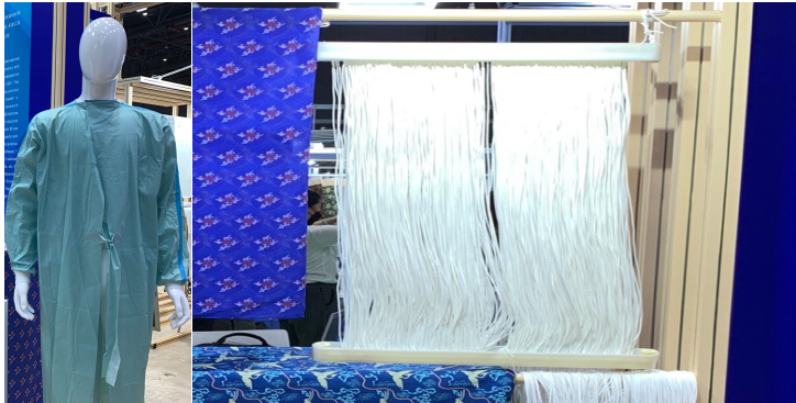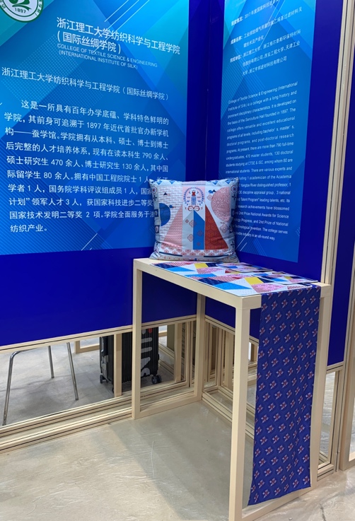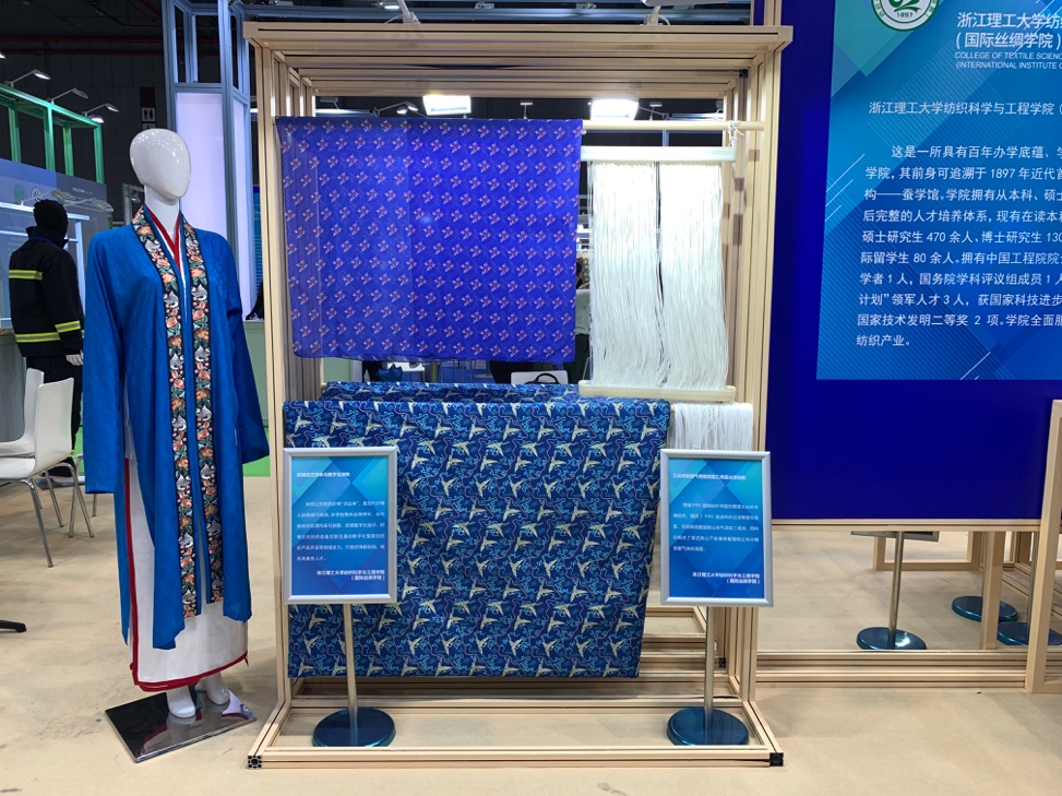 以时间为脉络向大众呈现了南宋赵伯澐墓出土丝绸服饰、现代汉服、数字智能化设计的织锦以及基于湿抄/水刺技术的高品质手术衣、工业排放烟气用聚四氟乙烯基过滤材料等。