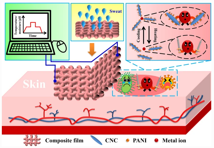 随后,研究团队发现一种全新策略将纤维素纳米晶/铁离子/聚乙烯醇(CNC/Fe3+/PVA)复合材料附于机织布上,可成功制备多种信号捕获和自驱动抗感染治疗的柔性织物基传感器。得益于体系中弱氢键和金属螯合等作用的影响,复合膜具有优异的机械性能、电导率和透气性,更可作为多功能传感器,实时监测人体体温、湿度、pH、NH3等信号。更重要的是,这种复合膜在高温刺激下,可主动释放Fe3+来消除细菌,具有自驱动抗感染治疗的功能。因此,复合膜在当前新冠疫情背景下体温实时监测预警和自驱动抗感染治疗等方面具有潜在应用。