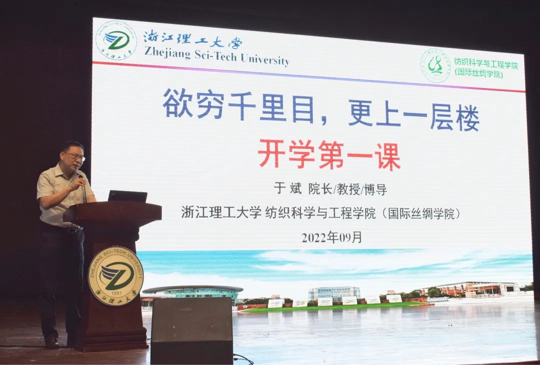院长于斌教授为22级新生讲“开学第一课”。于院长旁征博引、引经据典向大家介绍了纺织行业的发展、纺织学科的定位、纺织专业的特点等,并鼓励新生主动认识纺织专业的魅力,勇敢迈出学术钻研和科研竞赛第一步。同时,于院长向新生寄语,希望大家能够做到,学习为先、读书为本,懂得感恩、学会包容,脚踏实地、仰望星空,诚信为人、守牢底线,早立目标、持之以恒,保护自己、照顾家人。在开启新征程的前夕,于院长的教导振奋人心,言语间充满了对新生们的期望。至此2022级新生开学典礼暨第二届“五彩蚕丝”课堂启动仪式结束。