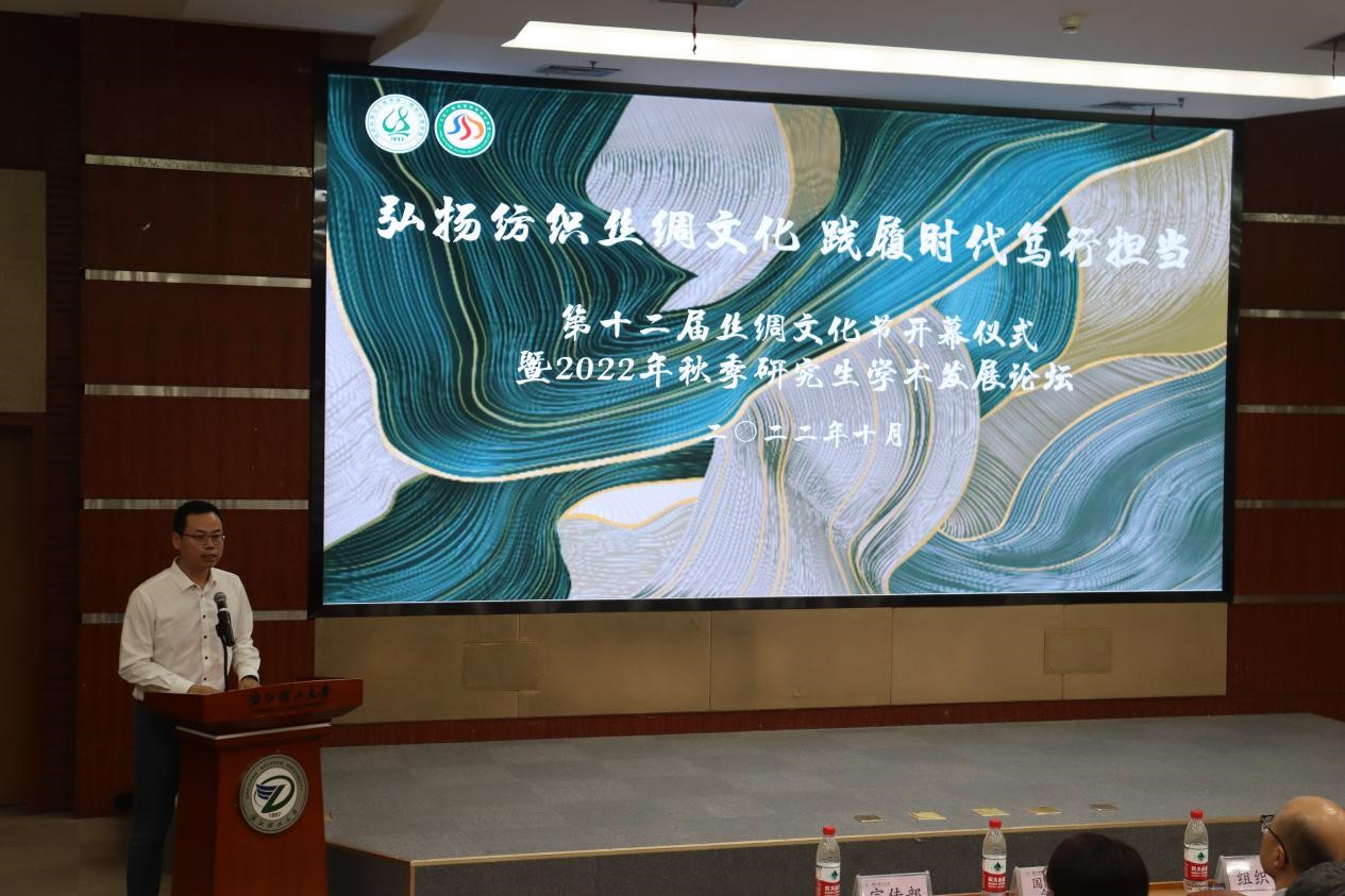 党委书记徐伟强致辞,他说,学校和学院在打造丝绸文化方面进行了长期的探索与实践,并指出丝绸文化节蕴含着文化自信、文化自强的浓厚气息,是校园文化育人、红色文化育人、丝绸文化育人的鲜明指向,希望广大同学能投身到纺织丝绸教育中,努力成长为富有实干精神、具有民族气节、自强自信的时代青年。