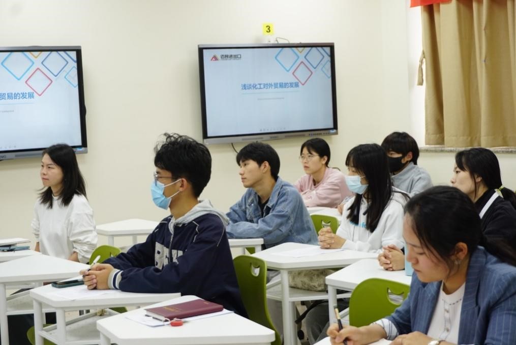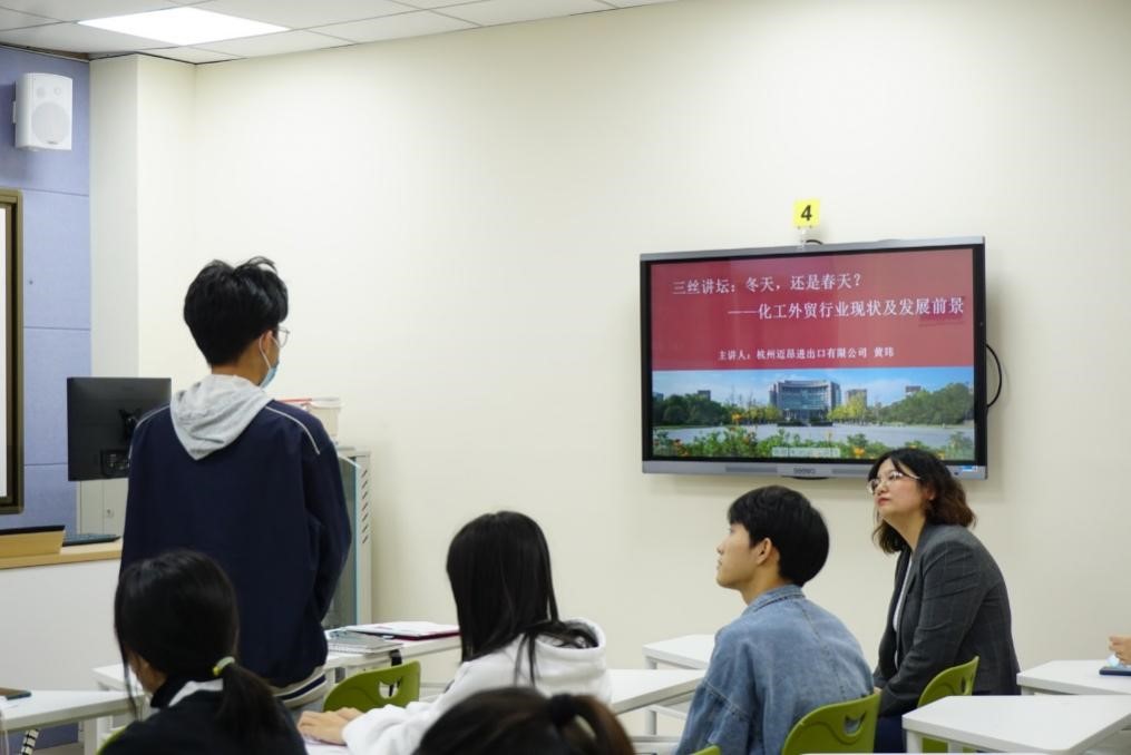 捐赠仪式后,“三丝讲坛”邀请迈昂公司副总经理黄玮在17号楼609智慧教室为同学们开讲《冬天,还是春天?——化工外贸行业现状及发展前景》。黄玮从目前趋势、面临挑战以及应对发展三个方面为同学们介绍了化工外贸行业的现实境遇,为同学们树立未来发展信心,现场反应热烈。