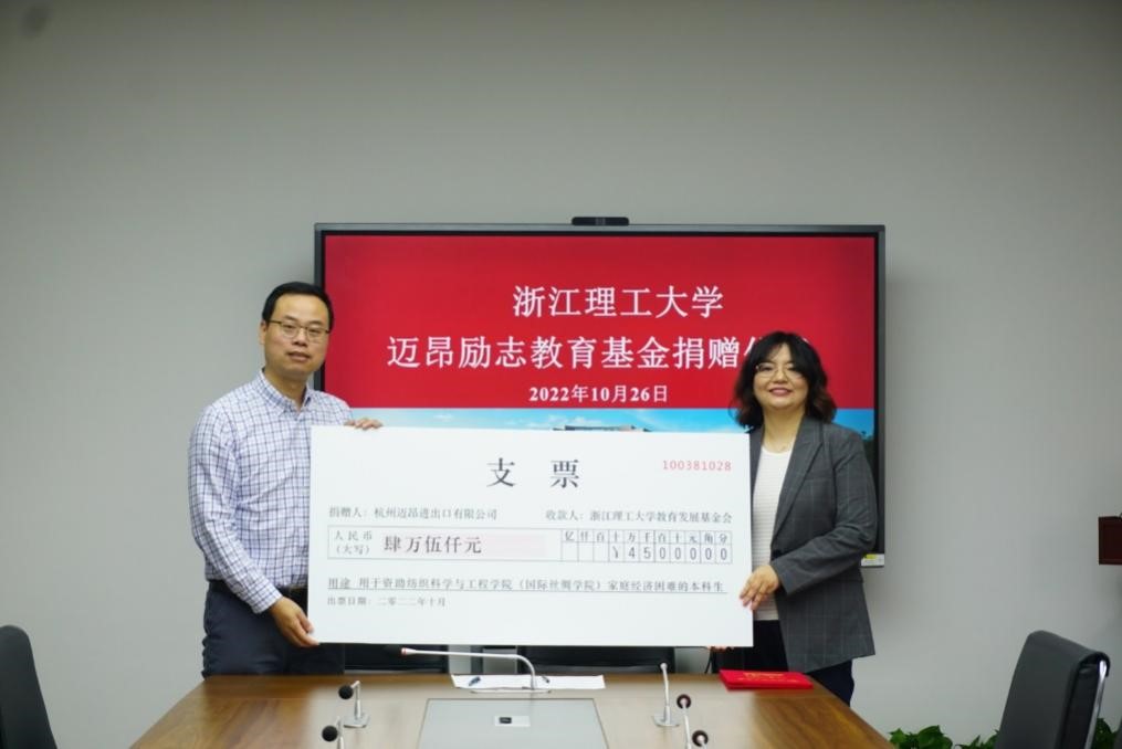 “迈昂”励志人物奖学金评比办法,之后,方平与杭州迈昂进出口有限公司黄玮签订捐赠协议书,颁发捐赠支票。