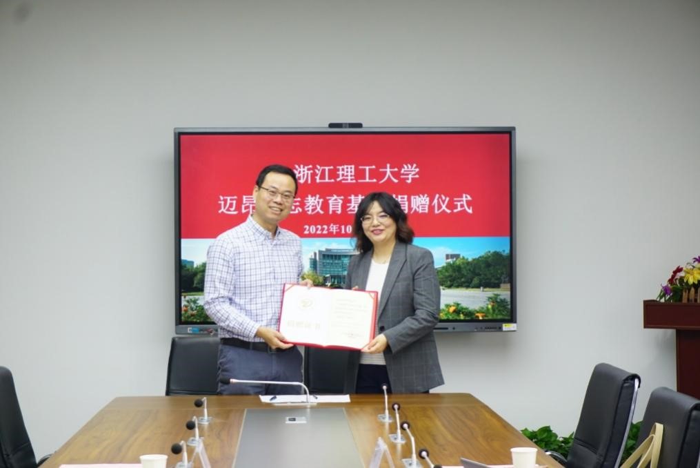于17号楼312会议室举行迈昂励志教育基金捐赠仪式,参加活动的嘉宾有杭州迈昂进出口有限公司副总经理黄玮、人力资源经理章琳,h图书馆