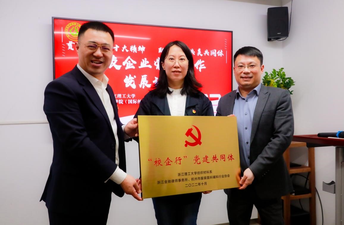 为了进一步增强党建就是生产力的共同意识,活动中纺织材料系与浙江金驰律师事务所、杭州市服装面料辅料行业协会联合发起并成立“校企行”党建共同体,以及建立“立德树人 德法兼修”教育基地,纺织材料教工支部与浙江省轻工业品质量检验研究院质量科技部支部签订党建共同体协议。