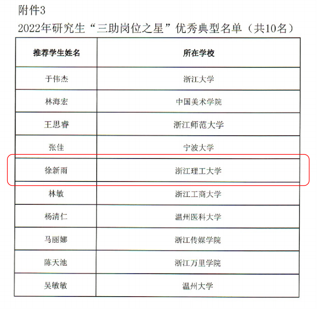 研究生徐新雨获评2022年浙江省研究生“三助岗位之星”