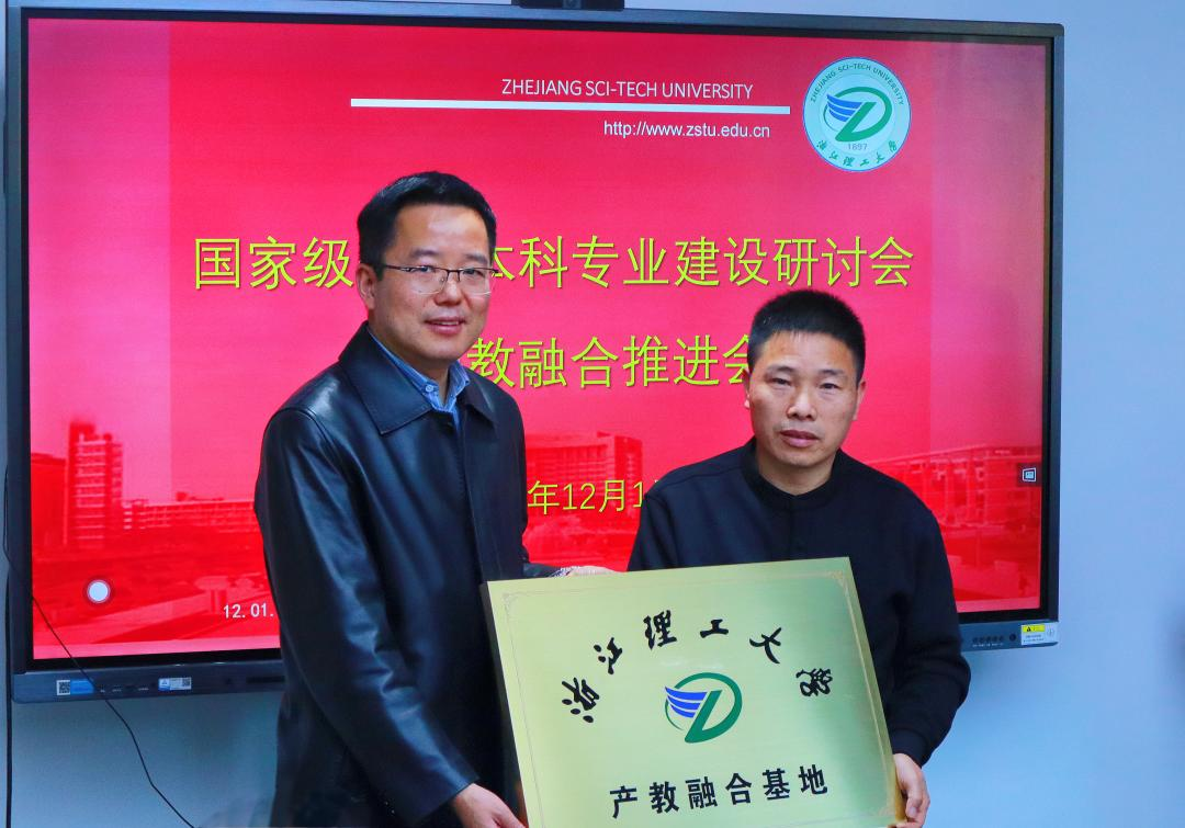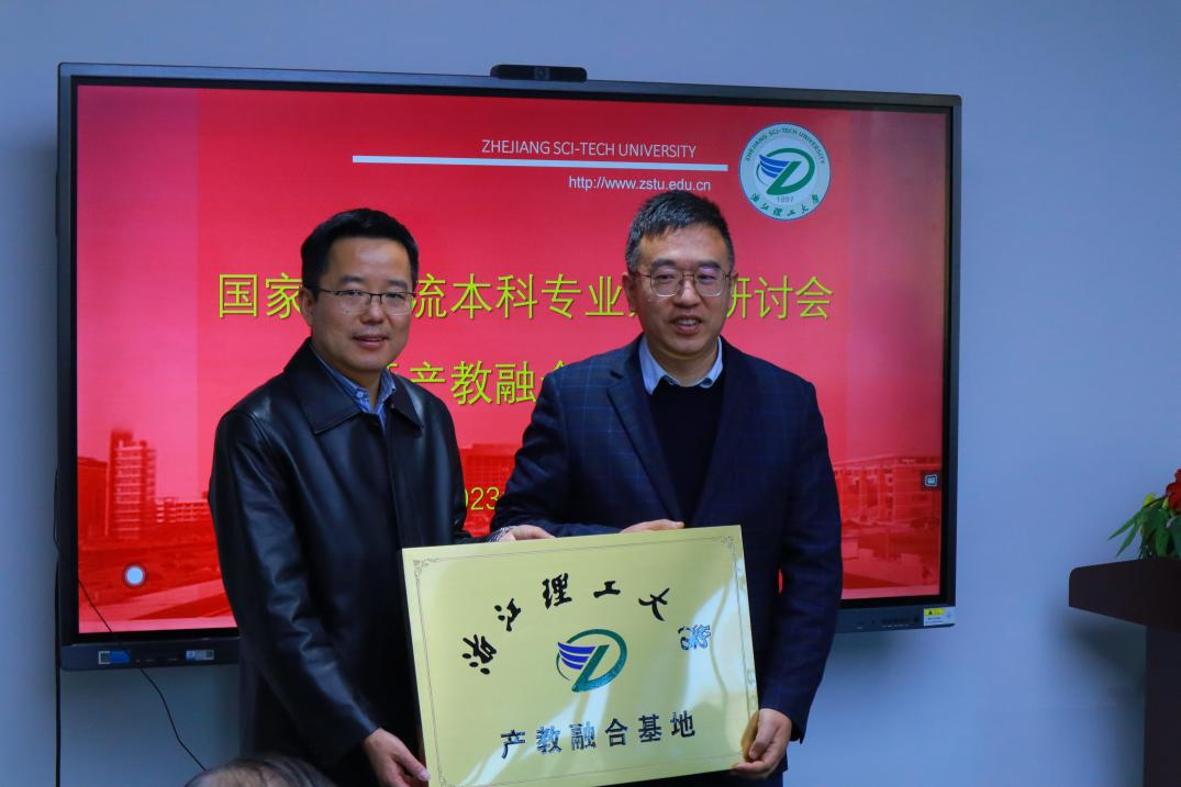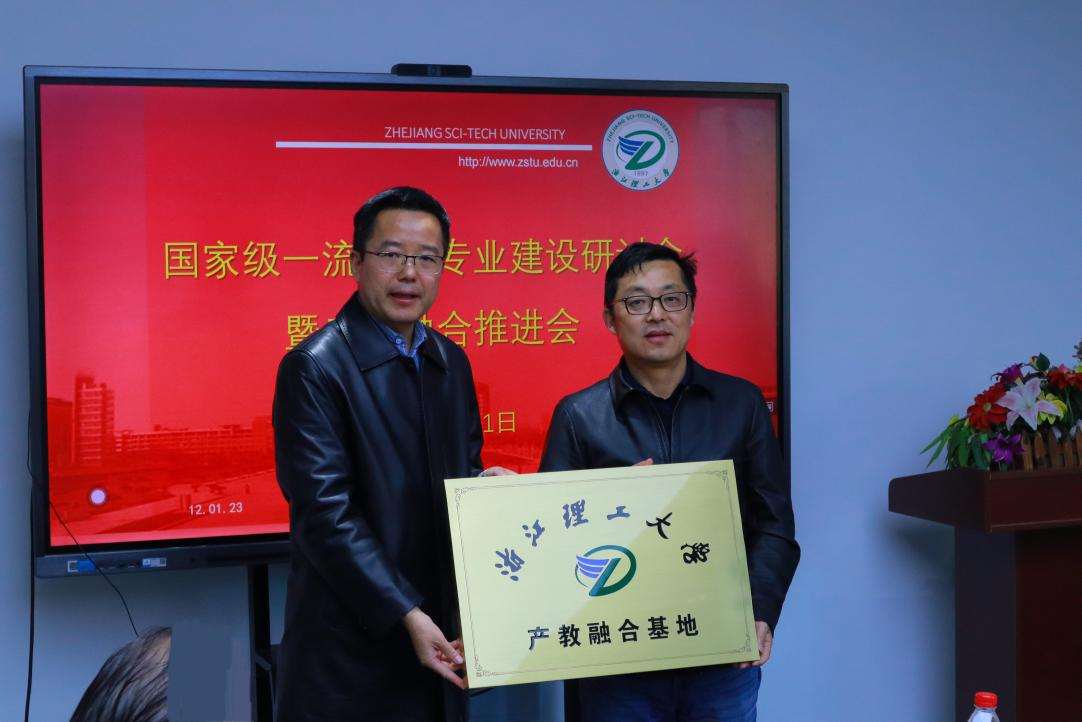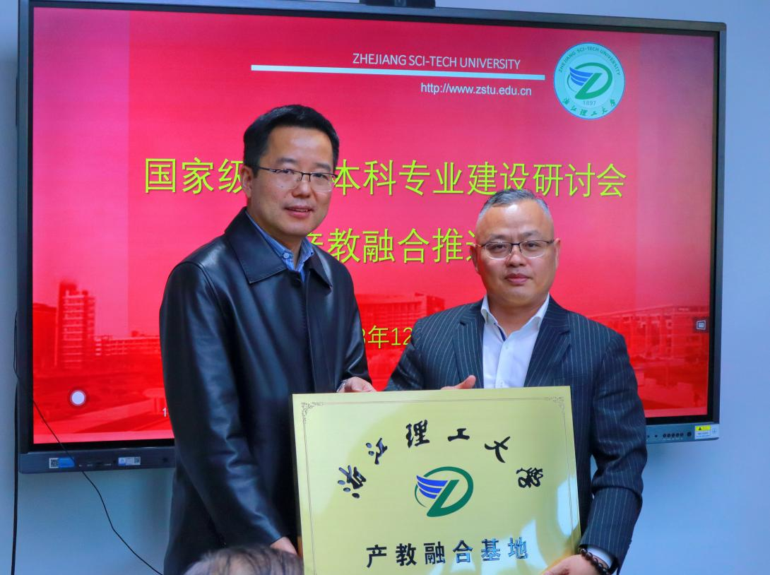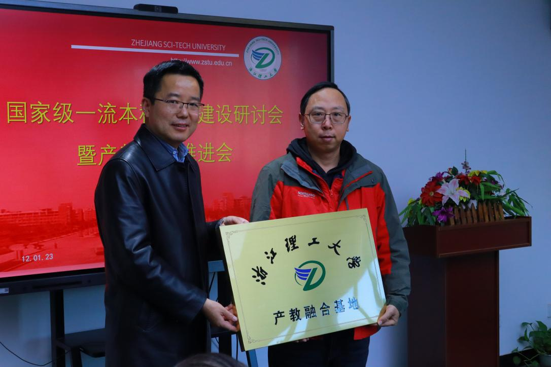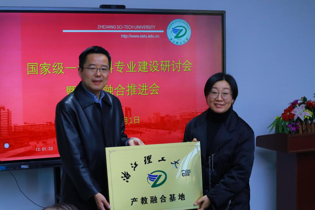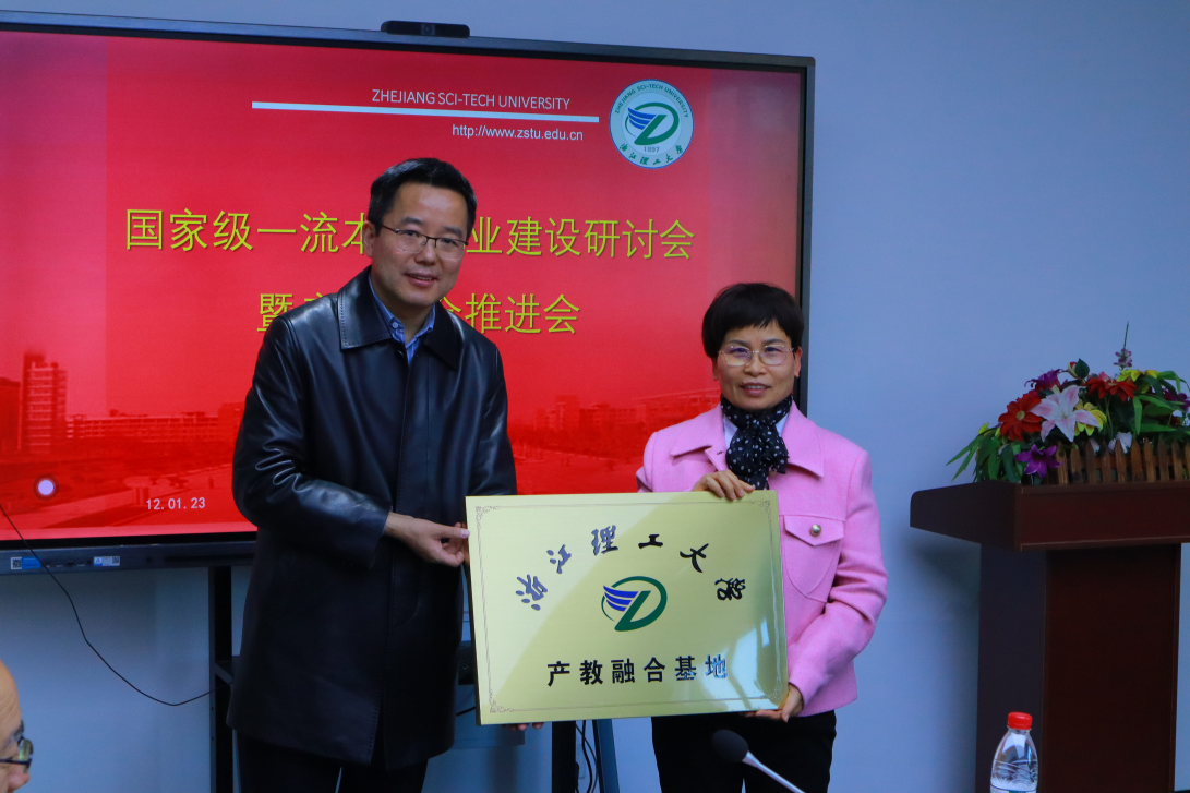 产教融合基地授牌。浙江古纤道绿色纤维有限公司总经理马建平,桐昆集团股份有限公司总工程师孙燕琳,浙江棒杰数码针织品有限公司董事长陶建伟,诺华(杭州)纺织有限公司董事长王雪柯,浙江集点科技有限公司董事长蒋增成,杭州经纬计算机系统工程有限公司董事长刘洋飞,义乌华鼎锦纶股份有限公司办公室主任张雪华参加了授牌仪式。
