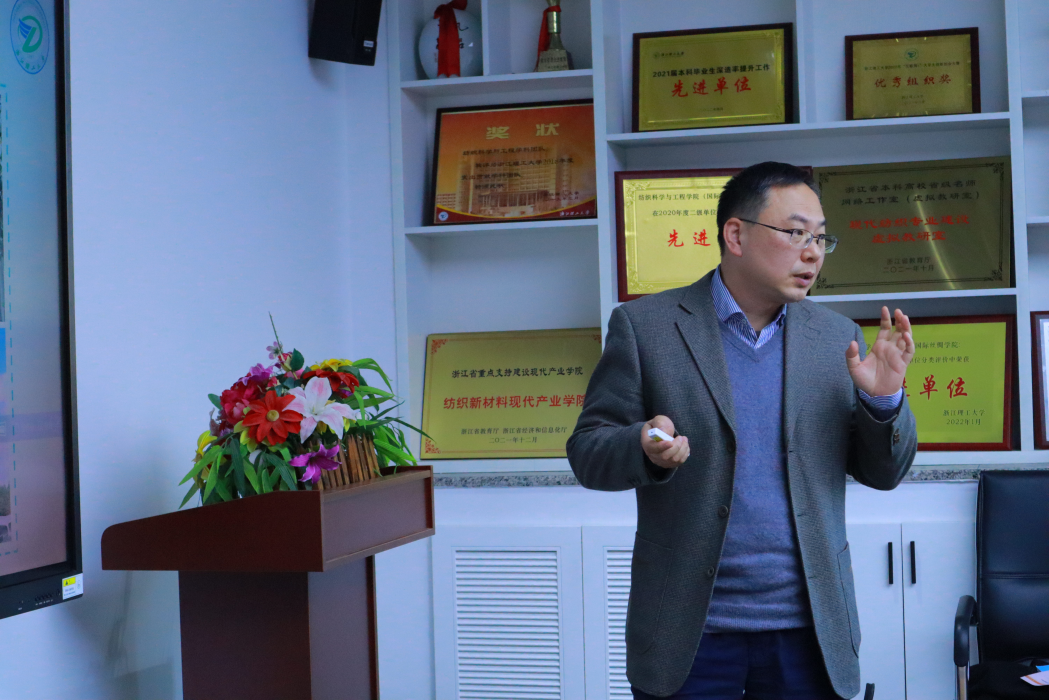 刘国金副教授汇报非织造材料与工程一流本科专业建设情况。他介绍了该专业为浙江省内第一个培养非织造材料与工程技术人才的专业,在过滤与分离材料和医疗卫生用材料方向形成明显特色。并分析了该专业对标工程教育认证要求,优化本专业培养目标、毕业要求以及课程体系,创建以“产品+设计”和“工程+技术”为理念的人才培养新模式。