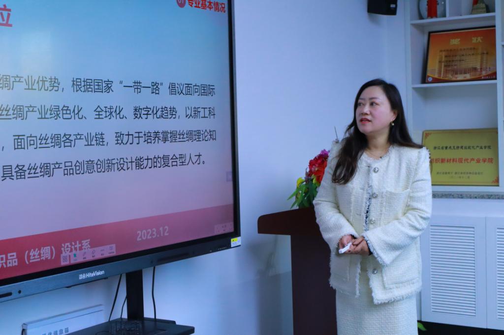 苏淼教授汇报丝绸设计与工程一流本科专业建设情况。她介绍了本专业“传承丝绸文脉、艺工学科交叉、馆校行企协同”的建设特色。并分析了“学科与专业层次化”布局专业方向和培养方案、“知识与能力多元化”建设“艺工结合”特色课程群、“人才与产业同步化”建设产教融合基地、“传承与发展国际化”培养丝绸人才和传播丝绸文化的专业综合改革举措。