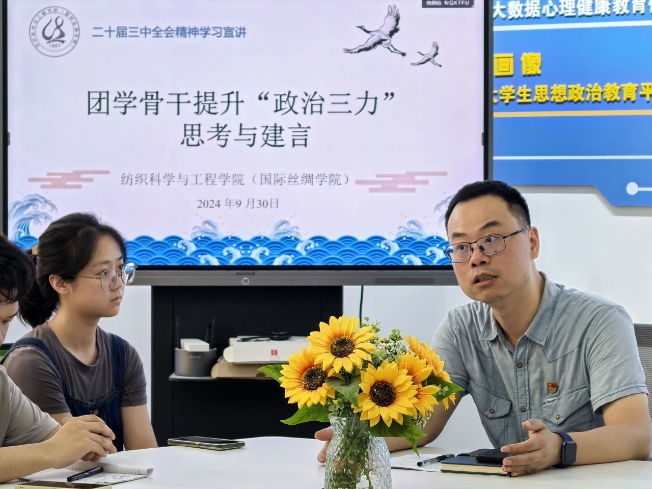 读书会上,方平从深刻认识党的二十届三中全会的重大意义、深入学习领会习近平总书记在全会上的重要讲话精神、全面准确理解《中国共产党第二十届中央委员会第三次全体会议公报》的主要内容等3个方面,结合新时代内涵、新质生产力特征、社会热点、学院党的领导和学科建设实际详细解读。方平指出团学干部要从四个方面提升“政治三力”:一是要学在深处,要强化政治理论学习,提升非专业素养;二是要干在实处,以身体力行强化实践,提升解决问题能力;三是要谋在新处,加强基础性研究,提升科技创新能力;四是要推进协同,提升组织凝聚力。方平强调学习、实践、研究和协同,是提升团学干部“政治三力”的基础素养,在日常工作学习中,团学干部要学会做有组织的科研、有组织的育人,有组织的工作。