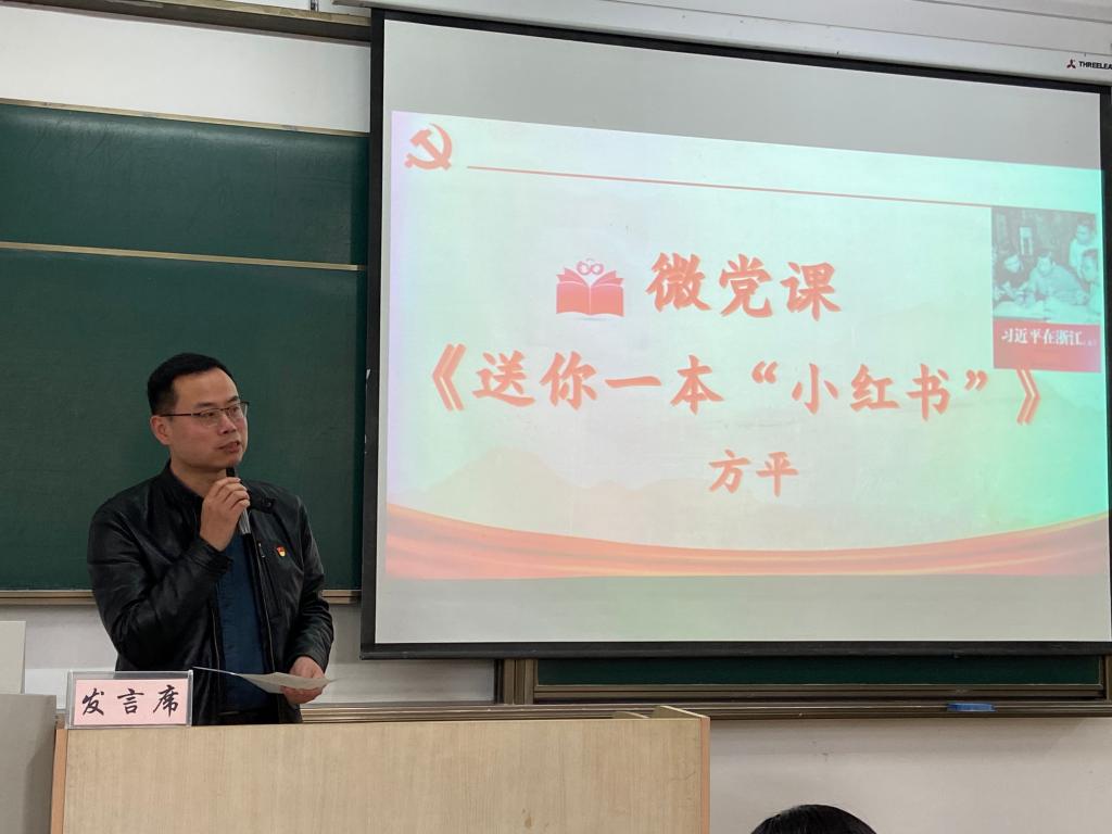 而后,学院党委副书记方平面向各学生支部党员讲授“送你一本小红书”的微党课。他以习近平总书记在浙江工作的经历出发,生动形象地表达了共产党员区别于一般群众的三大特质。第一是具有理论的牢固性。他表示一个民族要站在科学最高峰,就一刻也不能没有理论思维的支撑。第二是要具有知识的递进性。他表示在巩固理论知识的同时,要不断更新知识库,学会在学习中提问。第三是要具有革命的彻底性,增强斗争意识,培育斗争意识,经受住风骨、气节、操守和胆魄的考验。最后,他又向在座青年党员提出了三点期望:要学会读红书。可以通过打造书香支部、书香寝室来营造“红色环境”,塑造共产党员的文化自信。要学会治红学。百年党史一直都是在“问”和“答”的过程中书写,要学会回应时代之“问”,交出青年之“答”。要学会修红身。亮身份是自我激励,也是刀刃向内的斗争精神。只有知道自己是谁,才能明确未来要做什么,真正做到“共富共有共收获”。