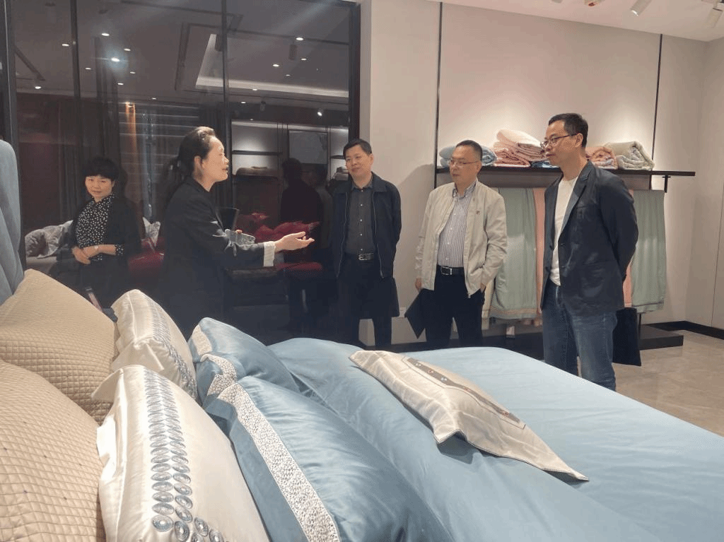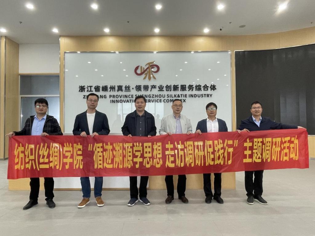 在嵊州知名纺织企业麦地郎纺织有限公司,调研人员深入产品展示馆,并与企业总经理袁学军、嵊州领带协会秘书长钱丰以及h图书馆